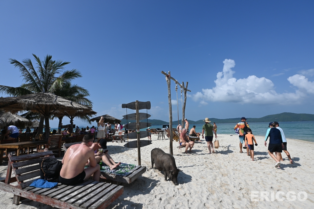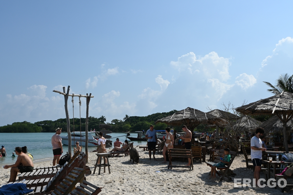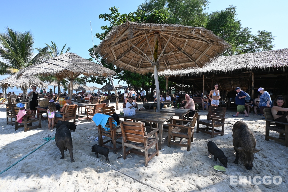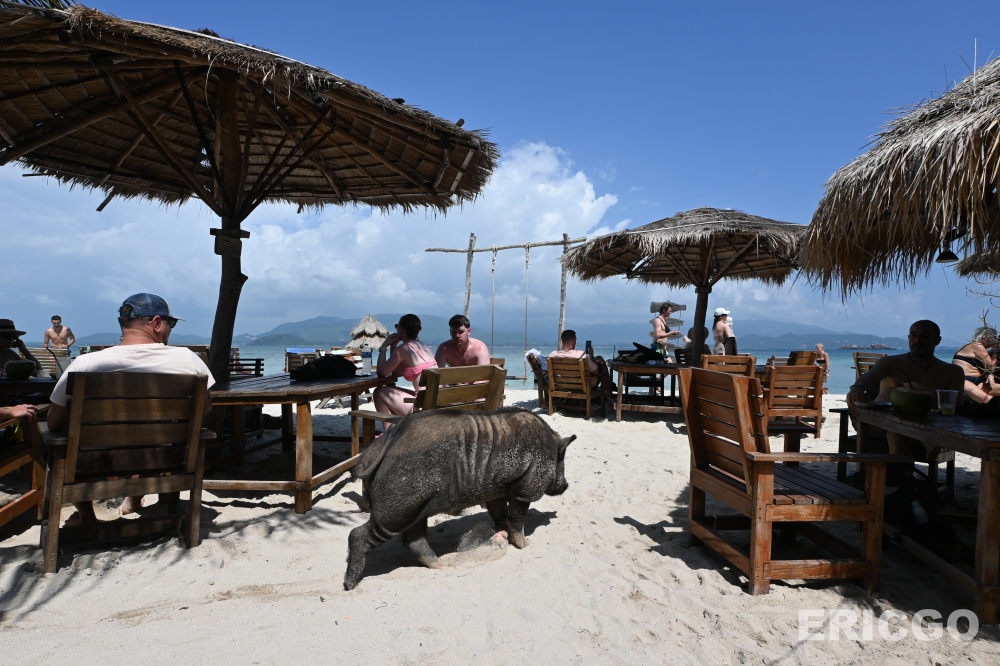 沙灘上也有一家酒吧,來瓶清涼的啤酒或果汁,一邊享受陽光,可愛的豬豬們還會在旁邊走來走去~