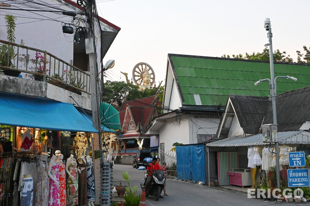 Wat Phra Yai 大佛寺雖然說是在東北方的一個小島 Ko Phan 上,但這個小島其實與本島相連,不說根本不會覺得是在一個小島上,通過一條短短的堤壩就可以抵達,可以直接開車或騎車前往。周邊還有許多小攤販。這些攤販販售著紀念品、當地小吃、咖啡廳。